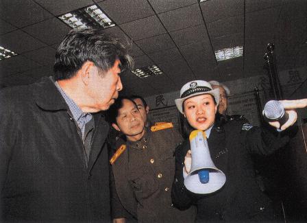 (09-3)中國新聞攝影學(xué)會執(zhí)行會長舒野、解放軍報高級記者江志順少將等在襄樊市交警支隊參觀采訪。