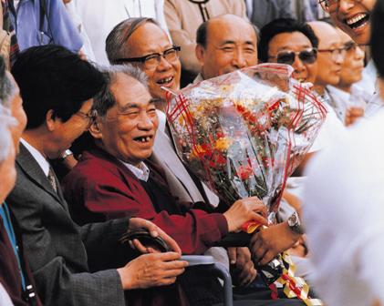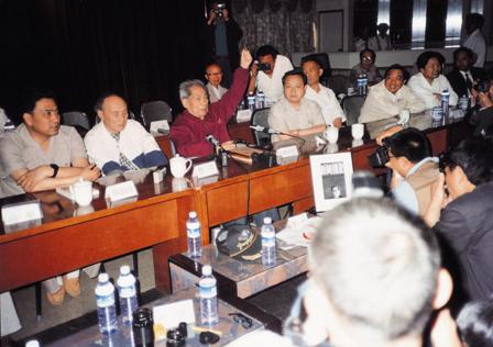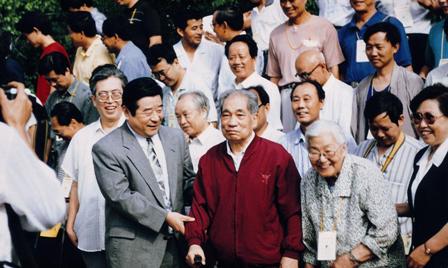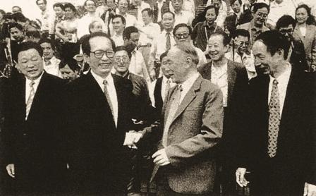 (07-1)中共湖北省委書記賈士杰同志(左二)看望穆青等與會代表。 曲河攝