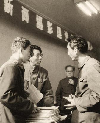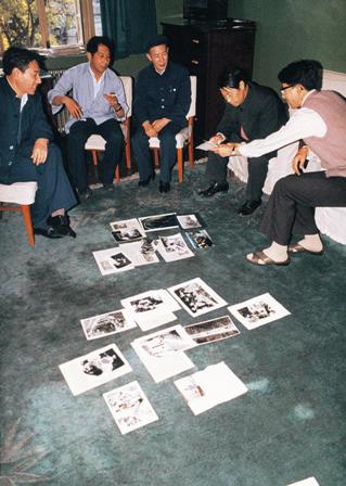 (13-6)蔣老講話:“為建立有中國特色的新聞攝影而奮斗!”左起:孫忠同、穆青、蔣齊生、范敬宜、王晨、張芬之等。