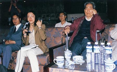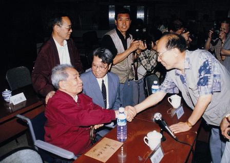 (04-1)在1990年11月5日于武漢召開的第四屆全國新聞攝影理論年會上,我國第一位中共黨員攝影記者羅光達(dá)(前左三)和中國新聞攝影學(xué)會會長蔣齊生(前左二),是中青年代表們采訪的對象。胡謀攝