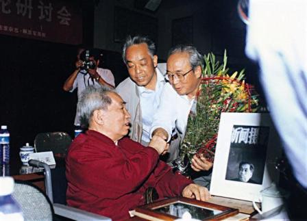 (04-2)在第四屆全國新聞攝影理論年會期間,蔣齊生會見了三十年代著名攝影家姚少滄(中)與著名老新聞攝影編輯家、教育家舒宗僑。胡穎攝
