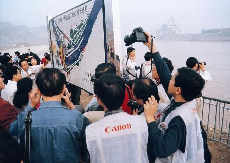 (07-3)參加第七屆全國新聞攝影理論年會的與會者,1997年10月16日到世界最大的水利工程長江三峽工地采訪,時距舉世矚目的大江截流只有22天。 舒澤金攝