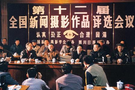 第十二屆全國新聞攝影作品評(píng)選會(huì)議1993年3月22日至26日在成都舉行。坐在主席臺(tái)上的左起:舒野(左一)、許必華(左二)、天寶(老紅軍、藏族左三)、姚志能(右一)。