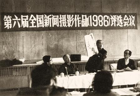 (05-3)在第六屆全國新聞攝影作品評選會議上,評委會主任蔣齊生對獲獎作品發(fā)表意見。左二羅光達,右一蔣少武,左一胡穎。