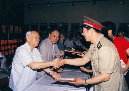 在紀(jì)念中國共產(chǎn)黨成立70周年全國新聞攝影展覽開幕式上,對第四屆全國新聞攝影理論年會獲獎?wù)撐暮偷谑畬萌珖侣剶z影作品評選獲獎作品同時頒獎。部隊攝影工作者舒澤金論文獲“新聞攝影學(xué)術(shù)成果獎”、攝影作品獲 “銀牌獎”,高興地領(lǐng)獎,老前輩連連夸獎“有軍人樣子,一下奪兩項大獎。可喜可賀!可喜可賀!”陳義攝