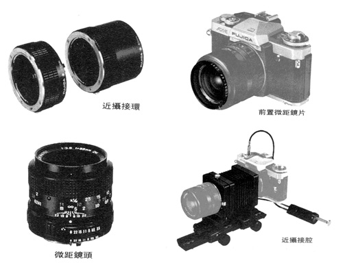 拍攝微小的動(dòng)植物時(shí),由于普通鏡頭的最近調(diào)焦距離無法滿足近攝的要求,必須加用近攝附件或選用微距鏡頭才能滿足近距離拍攝的需要。如果經(jīng)濟(jì)條件好,可購(gòu)置100mm的微距鏡頭。因?yàn)檫@類微距鏡頭成像質(zhì)量好,并可在較遠(yuǎn)的距離對(duì)鮮活的昆蟲調(diào)焦,不會(huì)驚擾昆蟲。如果經(jīng)濟(jì)條件不夠,也可配置一套近攝附件,如近攝鏡、近攝接圈及近攝皮腔等(見圖一)。只要在普通鏡頭前加用近攝鏡,或在鏡頭與機(jī)身間加用近攝接圈或近攝皮腔,便可將微小物體充滿整幅畫面,取得最佳的效果。但是,采用加近攝附件的方法調(diào)焦距離很近,只能拍一些靜止或移動(dòng)緩慢的的小動(dòng)物,或用于翻拍小照片等。