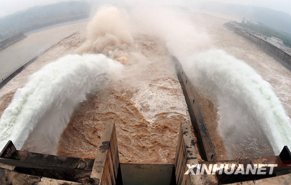 6月19日,從黃河小浪底排沙洞噴涌而出的黃河水沖向大壩下游。