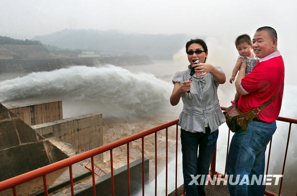 6月19日,在黃河小浪底大壩出水口頂部,來此游覽的一家三口準(zhǔn)備拍照留念。新華社記者 王頌攝