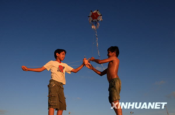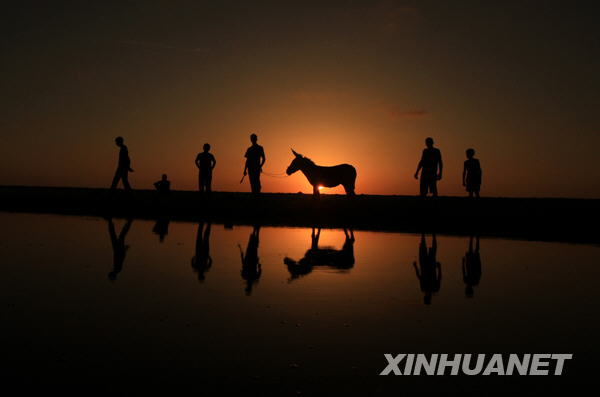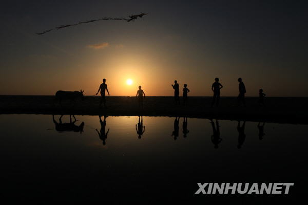 6月21日日落時(shí)分,幾名巴勒斯坦人在加沙城海邊流連玩耍,不忍歸去。新華社記者 納賽爾 攝