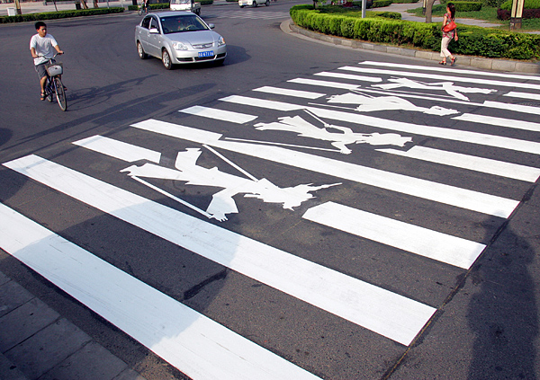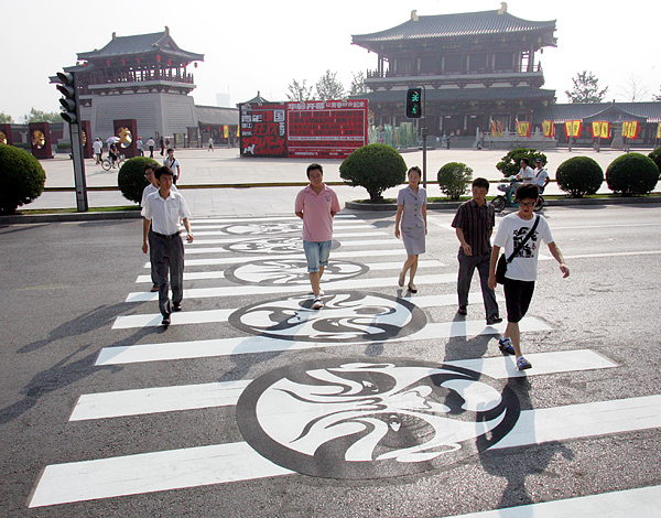 2009年7月7日,在西安市曲江芙蓉園街區(qū),兩條具有文化韻味濃厚,創(chuàng)意獨特、非常有個性秦腔戲曲臉譜、關中皮影斑馬線亮相街頭,吸引了眾多市民注意。