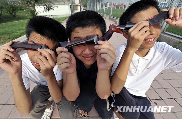 7月22日,三位中學(xué)生在濟(jì)南體育中心用膠卷觀看日食奇觀。