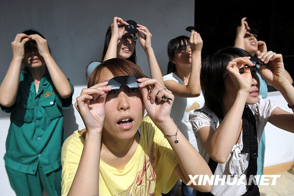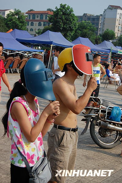 7月22日,一名九江市民透過熏黑的玻璃觀看日食奇觀。新華社記者章武攝
