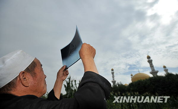 7月22日,銀川市永寧縣楊和鄉(xiāng)納家戶村的農(nóng)民在田間用X光片觀看日食。新華社記者 王鵬 攝