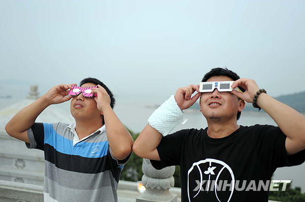 7月22日,兩名游客在浙江普陀山觀賞日全食。新華社記者 徐昱 攝