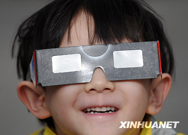 7月22日,長春一位市民透過兩副墨鏡觀賞日食景觀。新華社記者徐家軍攝
