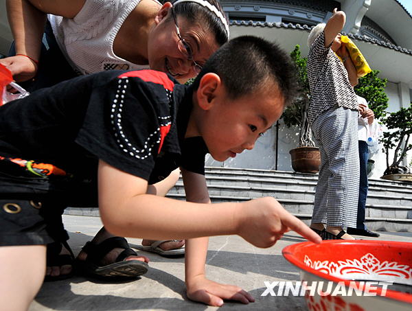 7月22日,在太原市兒童公園,一位小朋友通過水盆倒影觀看日食新華社發(fā)(孟晨光攝)