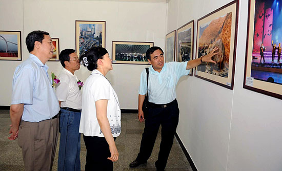 中國新聞攝影學會副主席、沈陽日報高級記者劉杰敏在向與會領導介紹參展圖片。