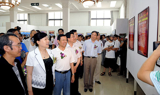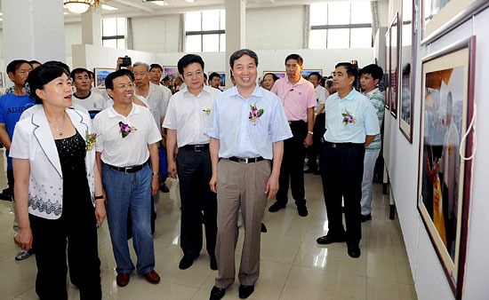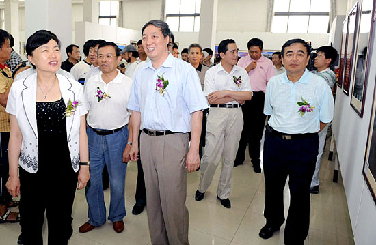 遼寧省副省長趙國紅(前左一)、中國新聞攝影學會執(zhí)行主席趙德潤(前左二)等領導參觀影展。