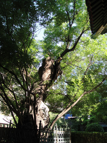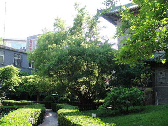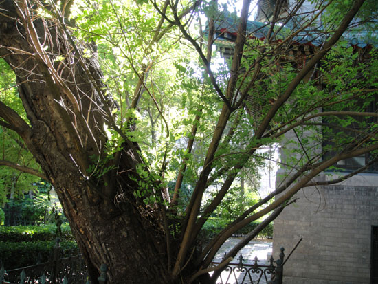 1921年,就在它的身旁,建起了一座當(dāng)時(shí)世界上最先進(jìn)的協(xié)和醫(yī)學(xué)院附屬醫(yī)院。感謝當(dāng)時(shí)的設(shè)計(jì)師和施工者,沒有傷害近在咫尺的老樹,而是保留了它。這是老樹的福氣。也是醫(yī)院的福氣。日月如梭,樹老矣,樓房亦老矣。老樹、老樓相依相伴,成了形影不離的朋友。夕陽中,老樓飛檐上的琉璃瓦閃著綠光,老槐樹濃密的枝葉間射出斑駁的綠影。綠光綠影,一靜一動(dòng),好不令人賞心悅目!