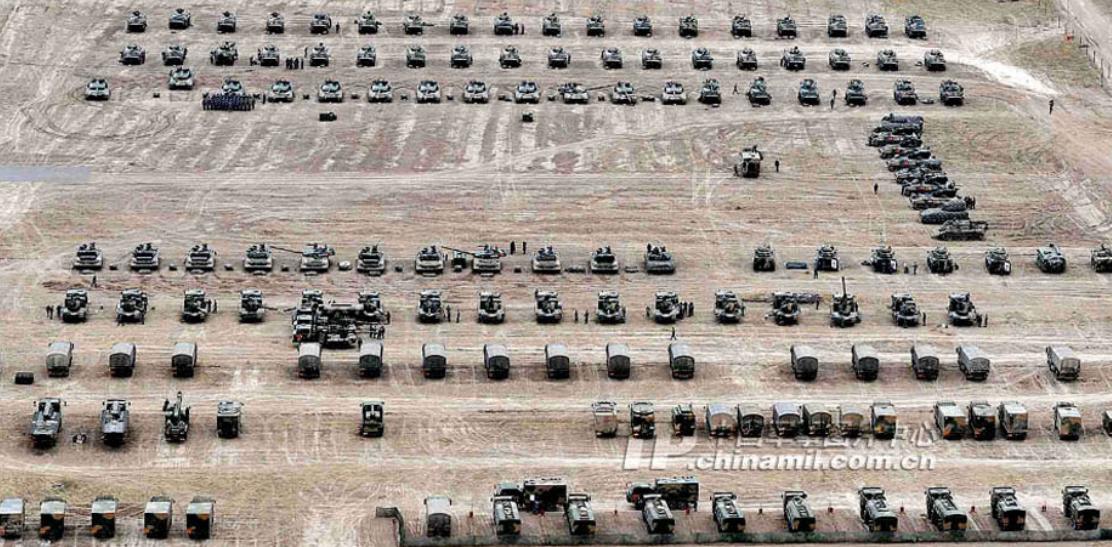 ??? “和平使命-2010”上海合作組織成員國聯(lián)合反恐軍事演習于2010年9月14日、15日舉行了兩次各方參演部隊的不帶彈合練。圖為中方參演的全部裝備。