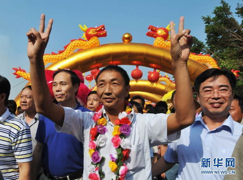 當(dāng)日,被日方非法抓扣的中國漁船船長詹其雄返回家鄉(xiāng)--福建晉江市深滬鎮(zhèn)港滬村。當(dāng)?shù)剜l(xiāng)親熱情迎接他歸來。 新華社記者張國俊攝