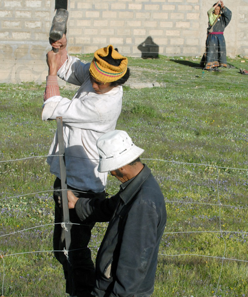 藏族牧民在修建牧場(chǎng)圍欄