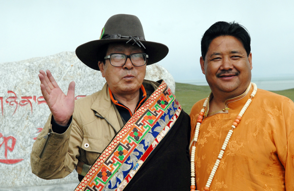 作者胡穎與瑪多縣委宣傳部部長扎洛(藏族)在迎親灘合影(宋亦增攝)