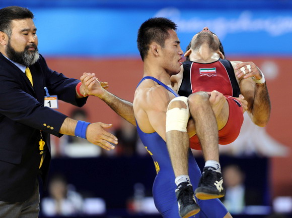 ??2010年11月23日,中國(guó)選手高峰(中)抱起受傷的伊朗選手賽義德·艾哈邁迪·扎林科拉伊離場(chǎng)。當(dāng)日,在第16屆亞運(yùn)會(huì)