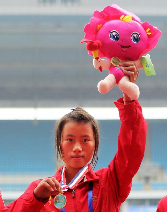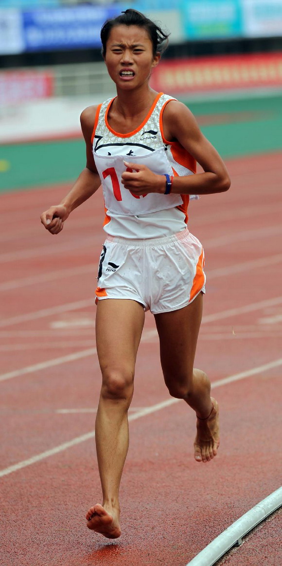 2010年9月25日,河南省第十一屆運動會田徑比賽在洛陽體育中心舉行,在女子乙組10000米決賽中,洛陽參賽隊員施丹麗跑到第二圈時鞋子被后面的隊員踩掉,施丹麗沒有遲疑繼續(xù)奔跑。