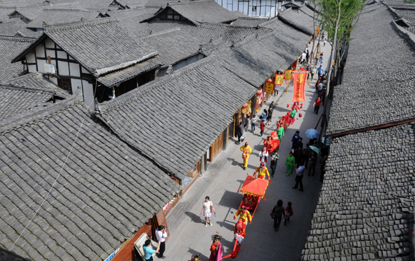 2、當?shù)芈糜尾块T在古城的街巷中為游客演繹古代“迎親”的場景。