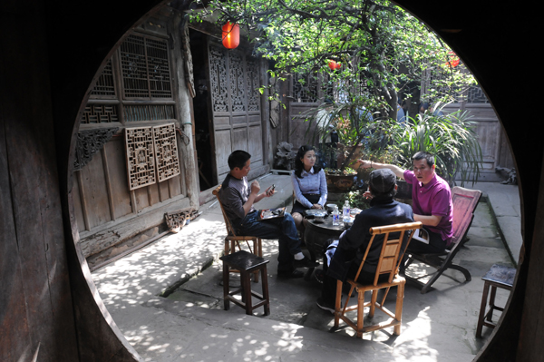 3、坐在古城中綠色成蔭的小院里品茶、聊天別有一凡風味。