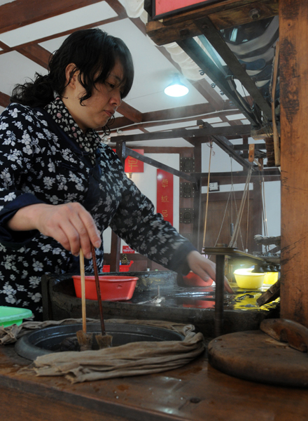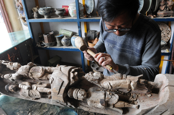 12、雕刻工藝師在古城門店里精雕細(xì)刻加工木雕。