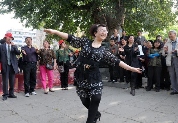 14、一位游客在參觀閬中古城中高興地跳起了舞蹈。當(dāng)?shù)乩夏昝駱逢?duì)義務(wù)為來古城旅游的各地游客唱歌跳伴奏。