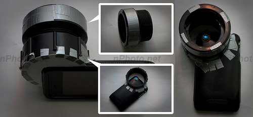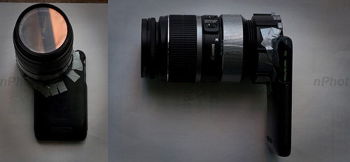 關于iPhone的創(chuàng)意配件和創(chuàng)意軟件我們也見了不少,即便是在iPhone的攝像頭上作文章的附件我們也見識了不少,不過你肯定沒有見過今天這么牛的一位。通過特殊的自制轉接環(huán),將佳能數(shù)碼單反鏡頭 EF-S 18-50mm 轉接到iPhone上,從而實現(xiàn)真正的光學變焦。下面我們還是來一起看這個神器是怎么做出來的吧。