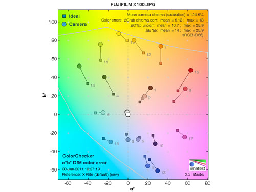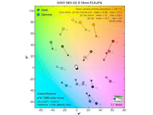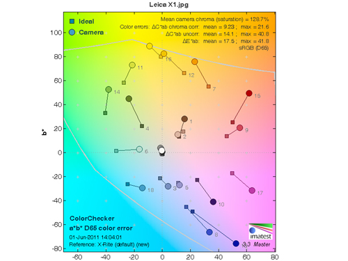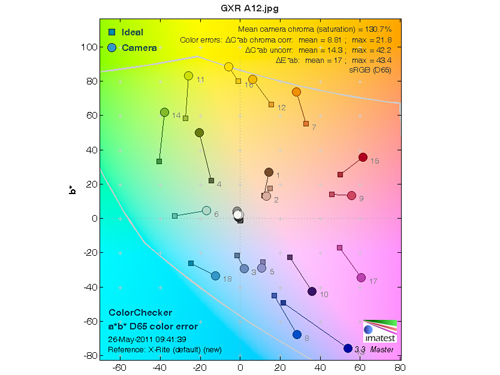而從理想色彩值(方色塊)和實際拍攝值(圓色塊)的對比可見,徠卡X1、理光GXR A12 28mm和三星NX11對藍(lán)青色表現(xiàn)的相對敏感,而且色彩飽和度較高這樣拍出的照片會顏色會相對艷麗,而富士NX100和索尼NEX-C3色彩飽和度則較低,能在后期時留出更多的調(diào)整空間。