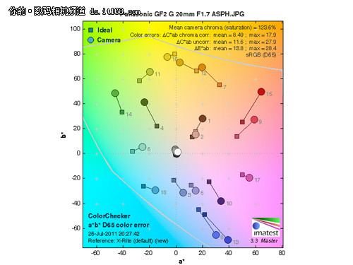 下圖反映出了松下GF2與G 20mm F1/7 ASPH的實(shí)際成像色彩值與理想值之間的差異。圖中被灰色線包圍的部分是松下GF2與G 20mm F1/7 ASPH的色域范圍(超出sRGB色域27.9%),測(cè)試圖中方色塊為理想色彩值,而圓色塊為實(shí)際拍攝值。