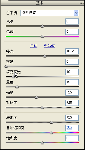 步驟1.用Photoshop cs5 中的Camera Raw打開照片,對(duì)照片的原始數(shù)據(jù)進(jìn)行二次調(diào)整矯正。一般原片都略有偏灰,因此首先要考慮的是還原色彩,數(shù)據(jù)設(shè)置如下:曝光+0.25、填充亮光10、黑色15、亮度-25、對(duì)比度+25,清晰度+25、自然飽和度+25,如圖所示: