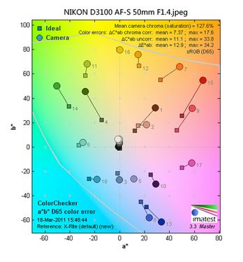 下圖反映出了尼康D3100在配合AF-S 50mm F1.4鏡頭時(shí),其實(shí)際成像色彩值與理想值之間的差異。圖中被灰色線包圍的部分是尼康D3100與AF-S 50mmF1.4的色域范圍(超出sRGB色域27.6%),測試圖中方色塊為理想色彩值,而圓色塊為實(shí)際拍攝值。