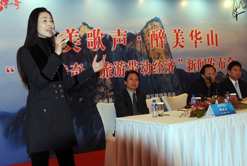 11月22日,青年歌手曹芙嘉在《華山傳奇》音樂電視專集首發(fā)式上演唱歌曲《走吧,咱們回家》。當(dāng)日,華山景區(qū)管委會在京舉行《華山傳奇》音樂電視專集首發(fā)式,著名詞、曲作家張農(nóng)科、孟慶云和一批青年歌手出席首發(fā)式并現(xiàn)場獻歌。這部音樂電視專集以西岳華山文化為題材,由《華山之上》、《望華岳》、《三月三上華山》等五首歌曲組成,歌曲旋律優(yōu)美、意韻悠久、大氣恢弘,展示了華山的壯麗景色和精深文化。據(jù)了解,華山景區(qū)管委會正在著力打造文化帶動旅游、促進經(jīng)濟發(fā)展的新品牌。王呈選攝影報道