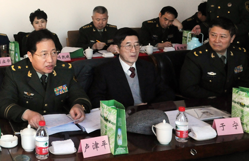 12月12日,武警政治部副主任盧津平將軍(前左一)在軍事攝影聯絡部第一次工作會上致歡迎辭。