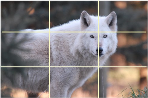 許多人都喜歡把要拍攝的人或物放在畫面的中心,要記住這都是初級者/菜鳥的做法,實(shí)踐證明,當(dāng)畫面主體處在整個(gè)畫面的三分之一處,即畫面偏左或偏右的位置時(shí)是最合適的。正像照片中所拍攝的狼一樣,狼頭恰好處在畫面三分之一處。