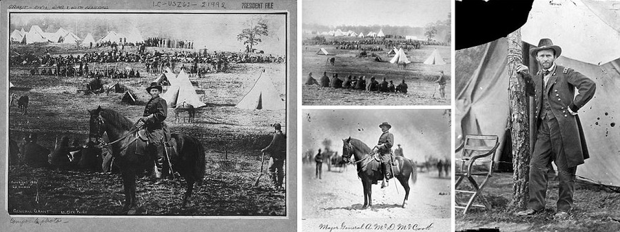 左側(cè)美國第18任總統(tǒng)尤利西斯 S 格蘭特當(dāng)將軍時(shí)騎馬的假照片是用右側(cè)三張照片合成的。