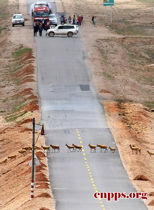 ????2011年7月27日,遠處的烏云剛剛散去,遷徙的藏羚羊就急忙排隊穿過可可西里青藏公路。可可西里五道梁保護站站長嘎瑪才旦和志愿者們在這里守護攔車為藏羚羊通過青藏公路保駕護航。(第22屆中國新聞獎攝影作品初評入圍作品)