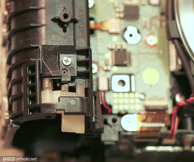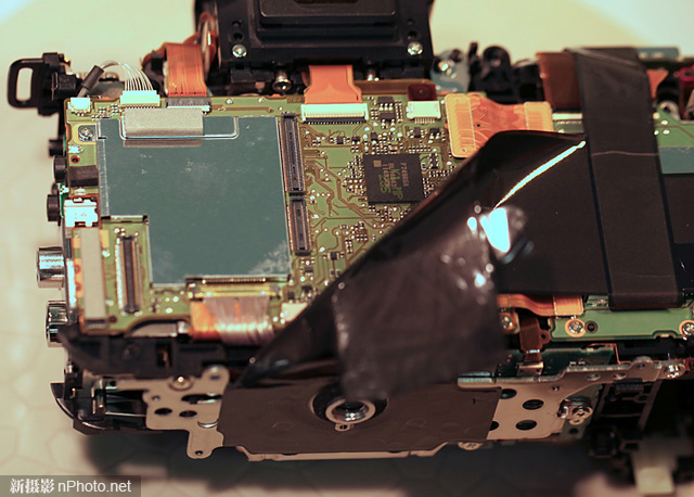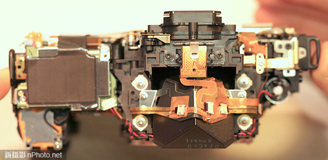 相機(jī)頂部沒有什么特別之處,仍然能看到到處都是干凈整齊的排線和線路。注意這臺(tái)相機(jī)還沒有經(jīng)過“漏光修理”,頂蓋內(nèi)沒有貼上黑膠布。