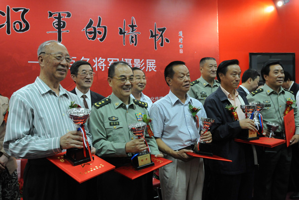 在《將軍的情懷——百名將軍攝影展》頒獎(jiǎng)典禮上,獲獎(jiǎng)將軍手捧獎(jiǎng)杯和證書合影。