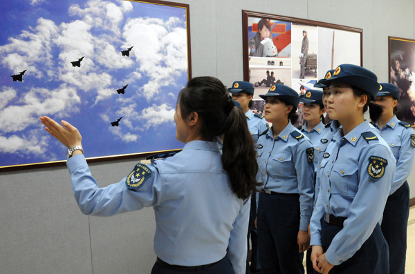 空軍女戰(zhàn)士觀看《將軍的情懷——百名將軍攝影展》照片。