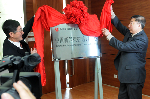 中國新聞攝影學(xué)會主席于寧(左)、東北大學(xué)副校長陳德祥共同為中國新聞攝影培訓(xùn)中心揭牌。