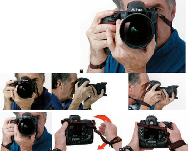5~7. 這也是基本握法的另外一種變化形式。當快門速度很慢時效果明顯,不過事后將手從扭轉(zhuǎn)的背帶中抽出需要花些時間。如圖所示,將相機背帶的松弛部分緊繞在手腕上,直到手腕被緊貼在相機上。