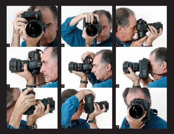 7~9. 這是在只有一個快門按鈕情況下的第二種豎立拍攝的方法,此時快門按鈕位于下方。這種握法使手肘向內(nèi),可以增加拍攝的穩(wěn)定性,但是右手的姿勢會較為別扭。解決方法之一是不用右手掌拖住相機,而是讓右手指握住相機后貼在左手掌上,把相
