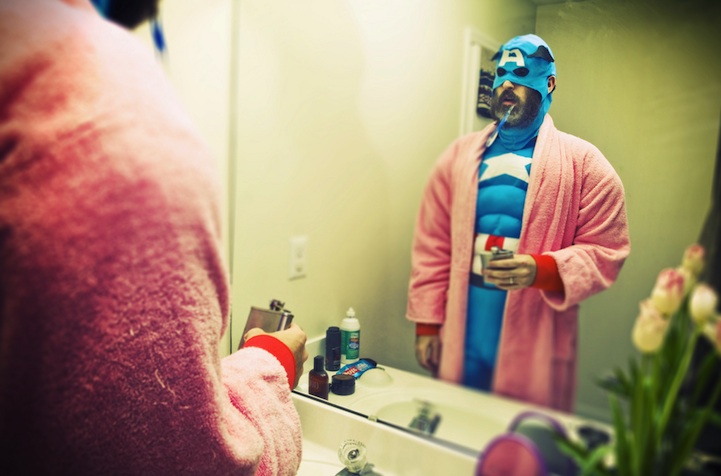 ????Armstrong于2008年開始,歷時(shí)兩年完成這一系列的拍攝。在作品中,Armstrong扮演電影《美國隊(duì)長》中的超級戰(zhàn)士。但這一次,超級戰(zhàn)士不再除暴安良,而是在索然無味的生活中苦苦掙扎:早早起床,一個(gè)人吃完早餐,一心等待著任務(wù)電話,卻遲遲不來,在黑暗中獨(dú)坐終日。